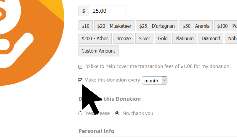 Our donation forms make it super easy to give recurring donations. Simply check the box next to the text that says “make this donation every”.
